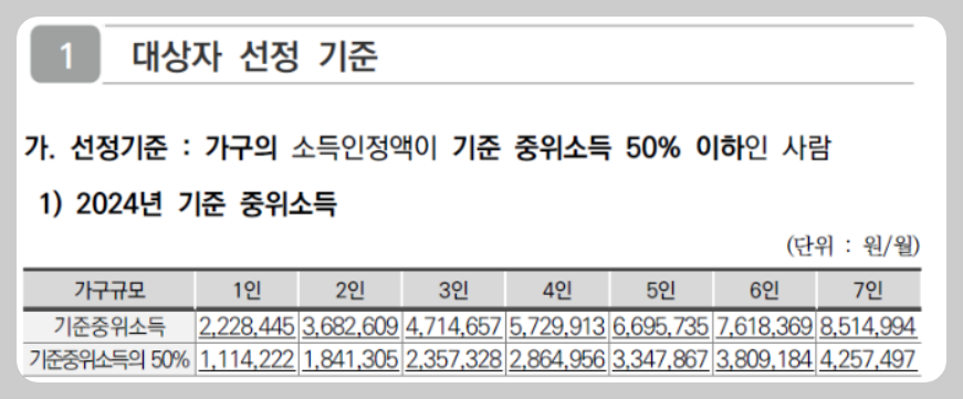 2024년도 기준 중위소득은 4인 가구기준 572만 9,913원이며 이에 50%는 약 286만원 입니다. 다만 소득은 적으나 재산이 많다면 탈락 될 수 있습니다.