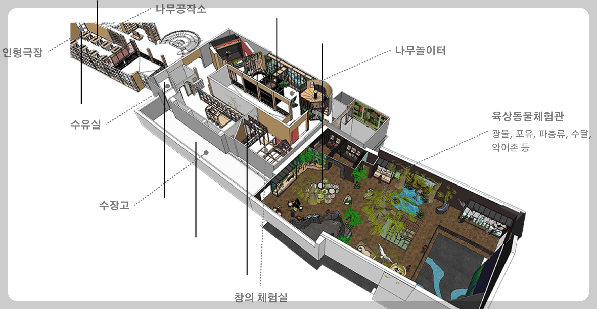 2층-나무공작소, 나무놀이터, 수유실, 육상동물체험관등