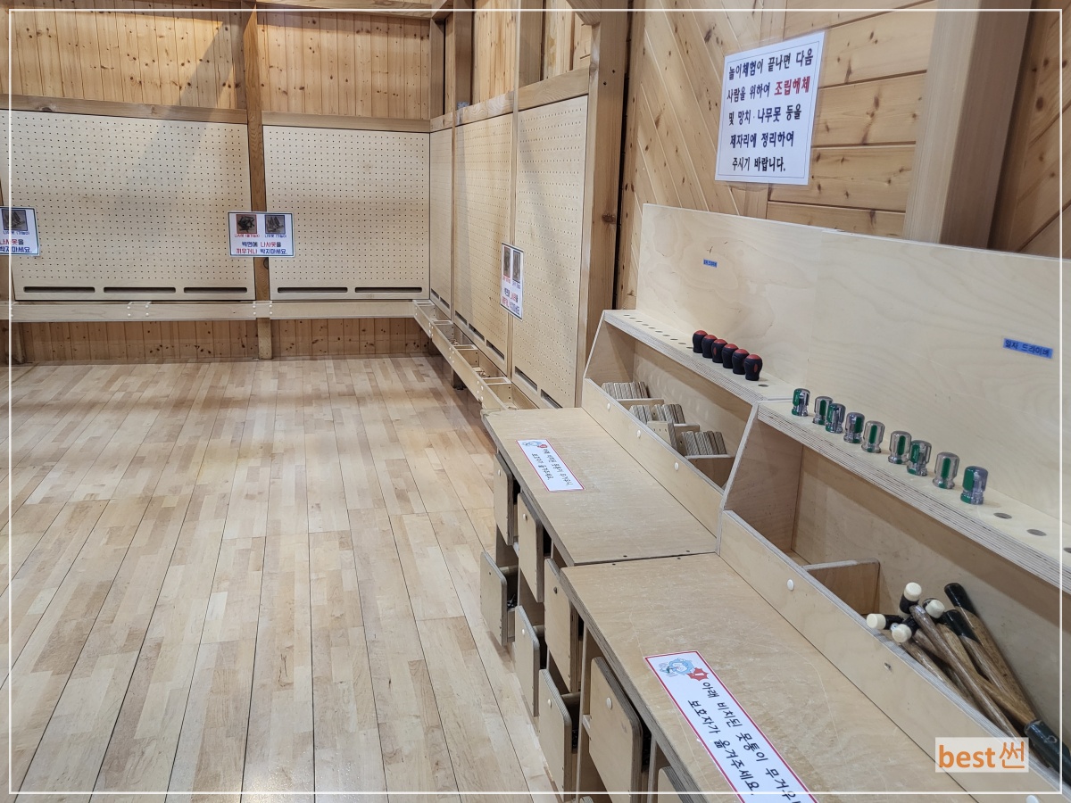 나무놀이터에서는 신발을 벗고 들어가서 다람쥐처럼 요리조리 올라가며 놀 수 있는 공간과 공구를 이용해서 놀 수 있는 창의체험실이 있어요. 나무놀이터는 너무 어린아이는 올라가기 어려울 수 있는 곳도 있다 보니 나이제한이 있는 것 같았어요. 그리고 창의체험실은 목재와 간단한 공구를 이용해 자유롭게 만드는 공간이었는데 보호자와 함께 하면 더 재밌을 것 같았어요