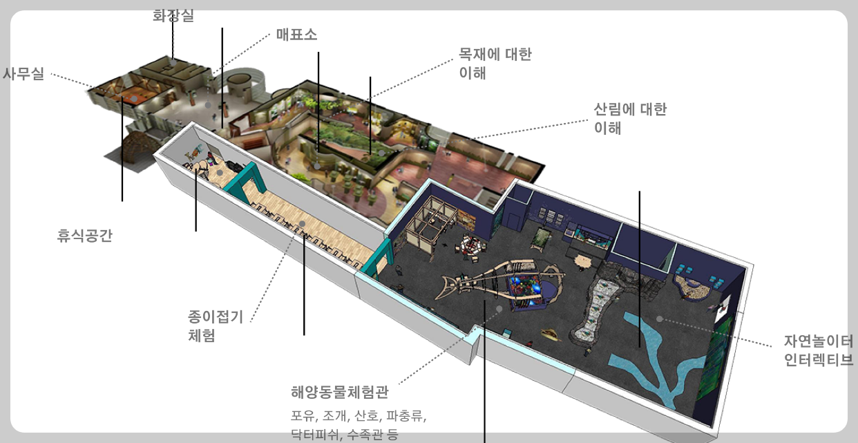 | 주요시설 | 1층-목재문화체험관,자연놀이터, 해양동물체험관, 휴식공간 |