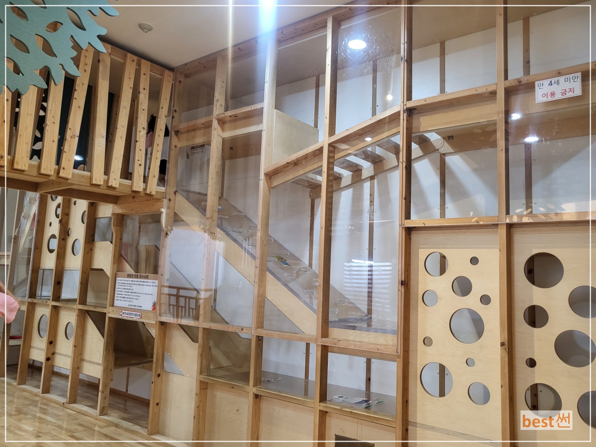 1층 목재문화/자연사체험관 → 2층 나무놀이터, 창의체험실, 육상동물체험관 →1층 해양동물체험관 순으로 보시면 질리지 않고 즐겁게 체험할 수 있습니다.